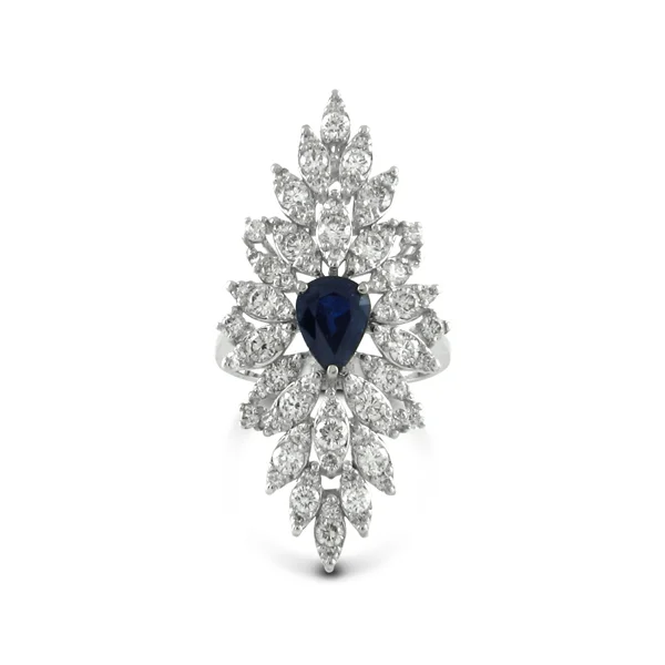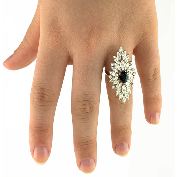 This ring is one of the biggest wow factors of them all. This cocktail ring makes a true statement. There are seventy-nine H in color and SI in clarity diamonds totaling up to 2.28 carats in weight. With a 1.75-carat stunning blue sapphire in the center of it all. This ring has a disco ball factor for someone who wants to make a statement. Compare at $14,999.00