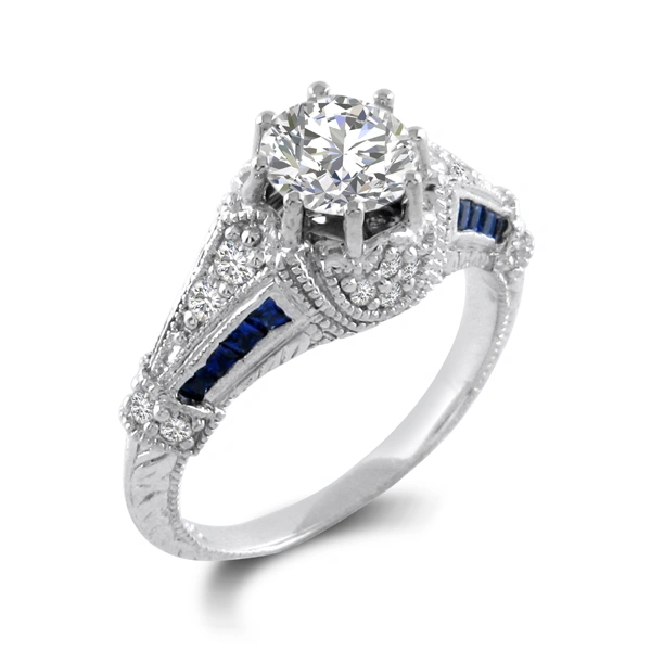 A newly created art deco design. The center stone is 1.18 carats which is G in color and VS in clarity. There is one third of a carat of stunning blue sapphires in the band along with an additional half carat of diamonds. Set in 18k white gold. Compare at $28,900.00 Please call us if you need alterations not offered here.