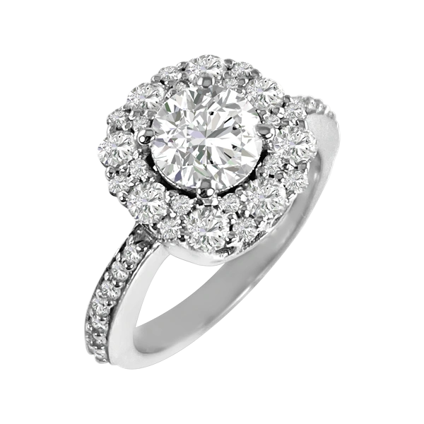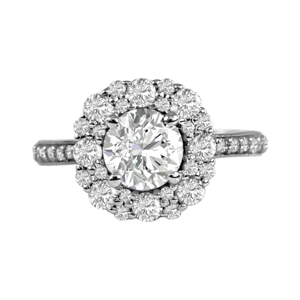 Almost a flower, but more of a mystery. At the heart of this ring is a 1.1 carat diamond that glistens; H in color, and VS in clarity. This multi-stone pave halo contains another one carat of diamonds. Thirty-nine side diamonds total. Set in 18K white gold. Compare at $39,900.00 Please call us if you need any alterations made to this piece.
