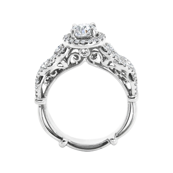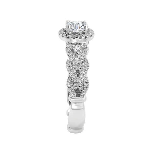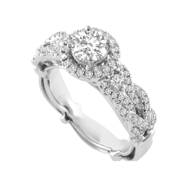 Diamond engagement Dubai style! The center stone is .75 carats with an additional .53 carats of diamonds woven in the halo and band. Center stone is H and VS in clarity. This is clearly a ring for multiple occasions. Set in 18k white gold. Compare at $14,999.00 Please call us if you need alterations not offered here.