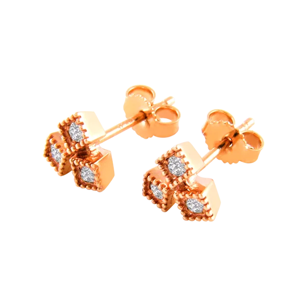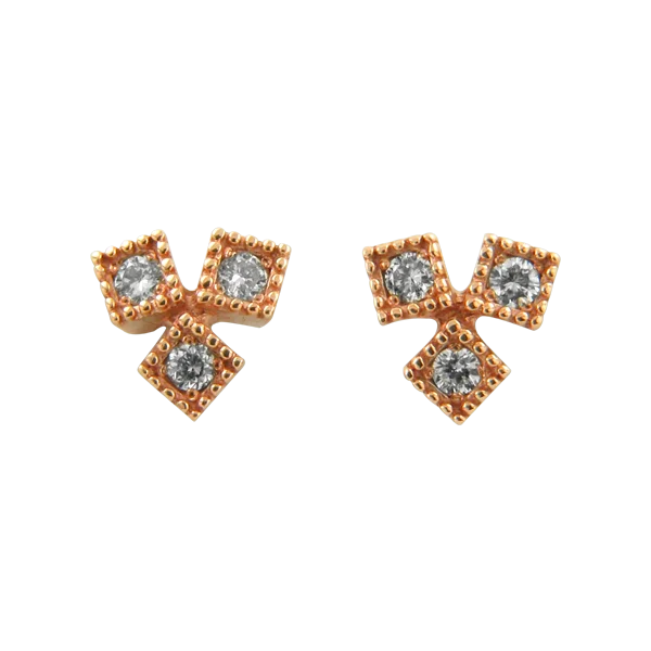 These beautiful diamond earrings are part of our Italy collection and scream sophistication. You could compare them to three leaf clovers. These six ultra white diamonds are H in color and SI in clarity that weigh a total of .25 carats. These earrings scream high fashion. Set in 18k rose gold. OUT OF STOCK. But we may be able to make it for you. Call and ask us about our custom designs.