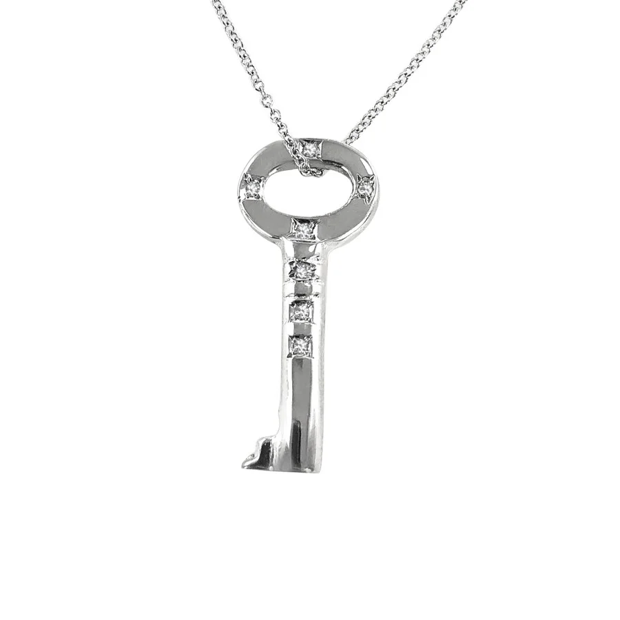 From our latest designs, this key pendant is a one-of-a-kind piece. There are seven diamonds total on this pendant and they are H in color and SI in clarity. The chain included with this piece is 18 inches. Set in 18k white gold. Compare at $2,499.00
