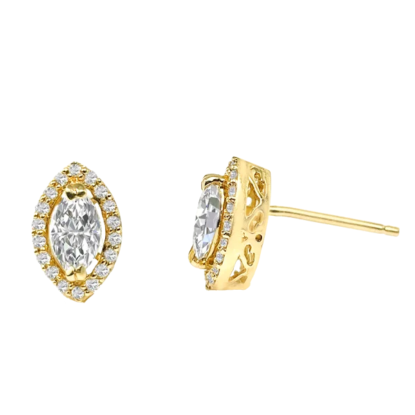 A little twist on the average diamond halo stud earring. With .69 carats of marquise diamonds, these earrings create a fun look that is perfect for any event. They are H in color and SI in clarity. The diamond halo contains thirty-six diamonds that are also H in color and SI in clarity, totaling .2 carats. Set in 14k yellow gold. Compare at $2,999.00