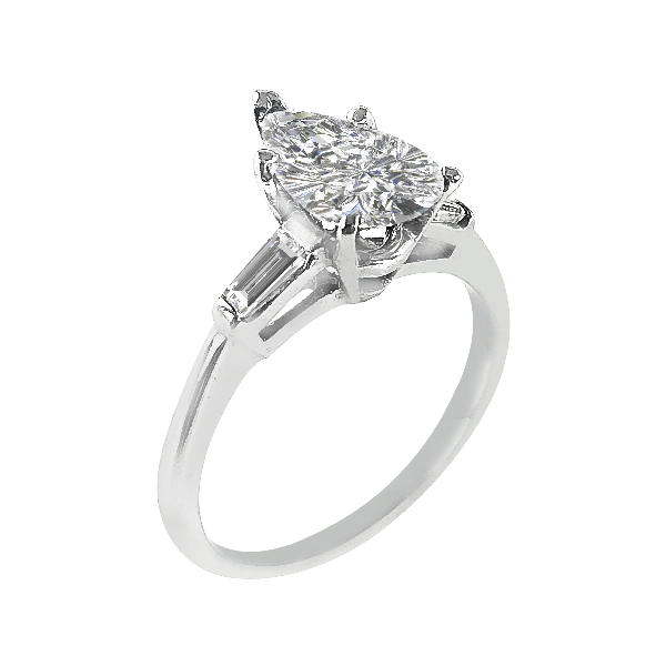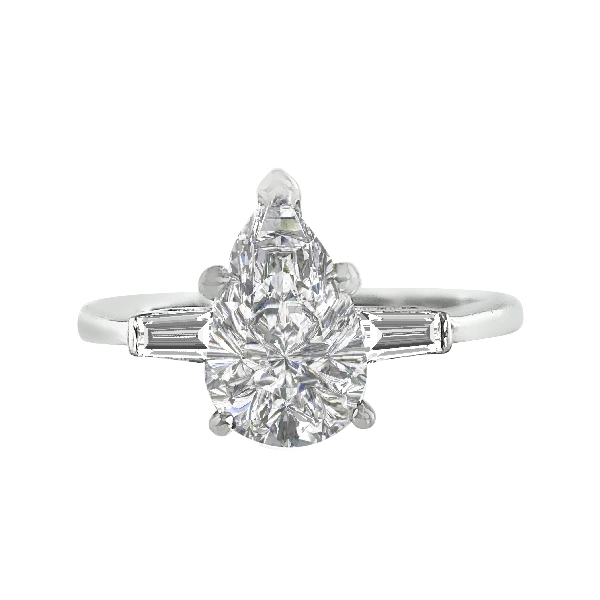 This premium diamond pear shaped ring has a simplistic beauty beyond compare. This diamond is H in color and SI2 in clarity. This pear shaped beauty is 2.3 carats total! To further emphasize the beauty of this stone are 2 baguette diamonds that are H in color and SI in clarity totaling .2 carats.