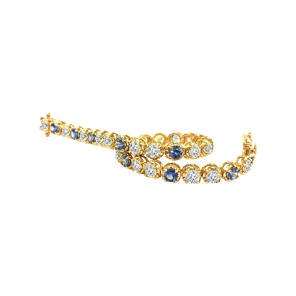 With five carats of H in color and SI in clarity, ultra white diamonds, this bracelet will stay sparkling at all angles. To compliment these wonderful stones come 3.5 carats of AAA in clarity blue sapphires. The elegant and eccentric design provides a whirlwind of color for any lucky person who wears it. Set in 14K rose gold. Compare at $24,999.00