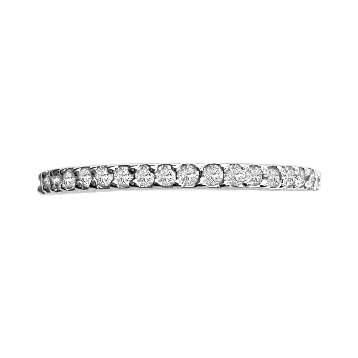 By itself, or with others, this ring will stand out and demonstrate how jewelry does not always have to be flashy to be beautiful. This could be used as a wedding band, a stack, or just a little treat to spoil yourself with. There are twenty-nine diamonds total that add up to .3 carats. These diamonds are H in color and SI in clarity. Set in 14k white gold. This ring contains a three quarters band. Compare at $3,499.00 Please call us if you need any alterations not offered here.