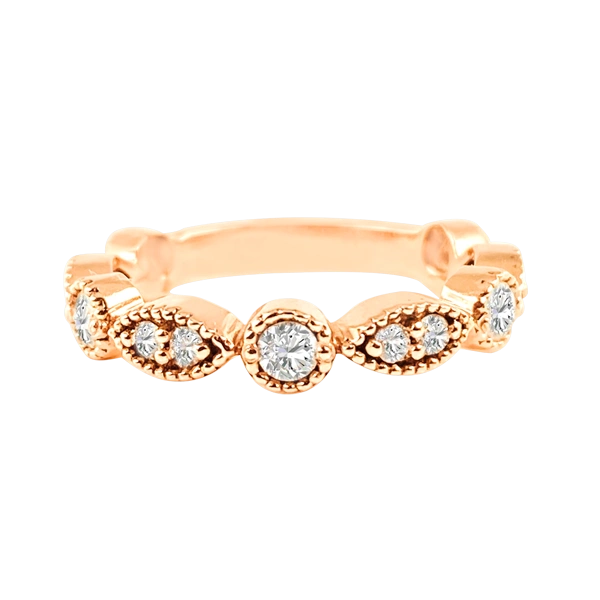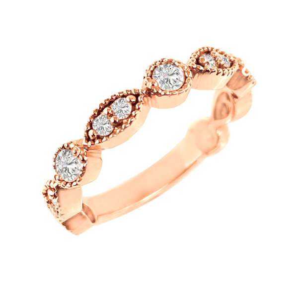 A beautiful rose gold piece that would look good with champagne. This ring bubbles with excitement the more you look at it. With thirteen diamonds total, it adds up to .75 carats that will sparkle beyond your expectations. Set in 14k rose gold. Compare at $3,599.00 Please call us if you need alterations not offered here.