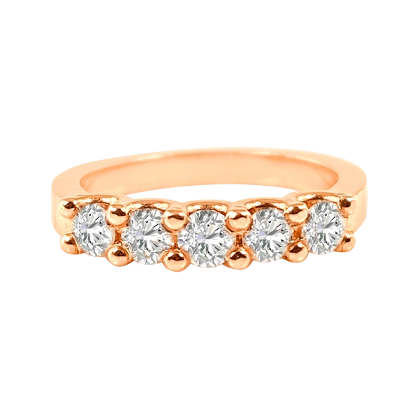 A beautiful rose gold piece that would look good with champagne. This ring bubbles with excitement the more you look at it. With five diamonds total, they adds up to .8 carats that will sparkle beyond your expectations. Set in 14k rose gold. Compare at $4,499.00 Please call us if you need alterations not offered here.