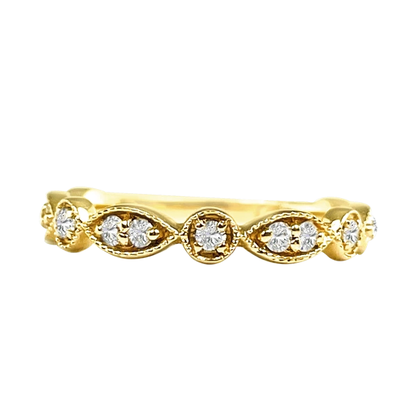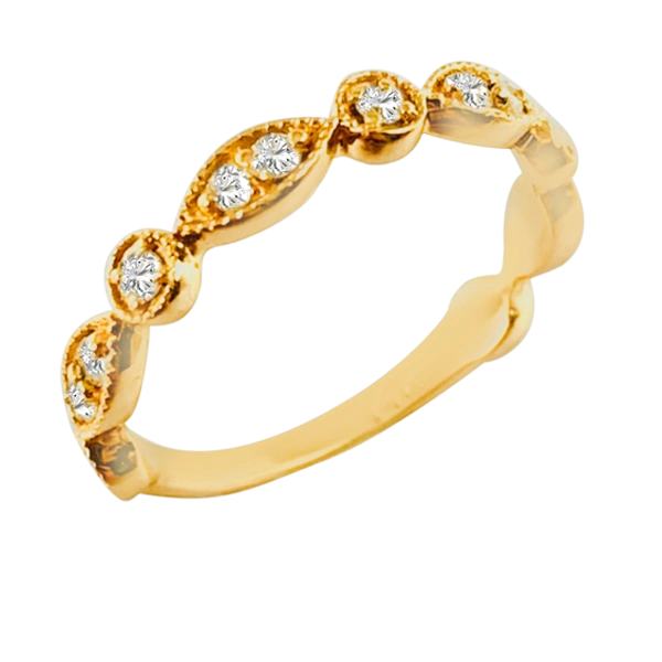A beautiful stacking ring. This bubbly diamond stacking ring is 14K yellow gold. This ring has thirteen H in color and SI in clarity diamonds that total .25 carats in weight. A simplistic beauty. Compare at $1,999.00 Please call us if you need alterations not offered here.