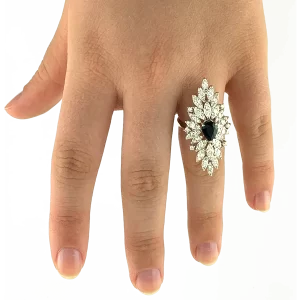 A sunburst of diamonds! This dazzling ring will light up your life in any way that you will let it. With a center stone of 1.01 carats and a halo of twenty-two diamonds, this ring drips in a flaring rainbow of color. The surrounding diamonds are .56 carats total and all diamonds are H in color and SI in clarity. Set in 14k white gold. Compare at $36,999.00 Please call us if you need an alteration not offered here.