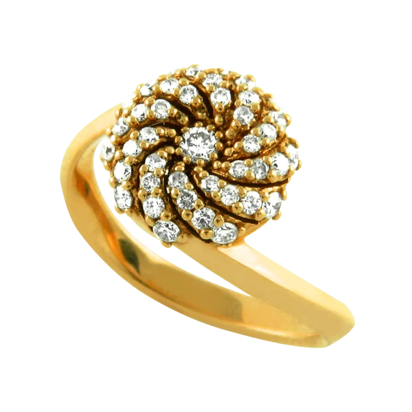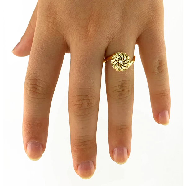 If you attack life with the force of a tornado, this ring is your “coat of arms.” The swirl is .5 carats of ultra white diamonds. A striking piece like this is manufactured in Italy and you know that that means– this piece is set in 18k yellow gold. Compare at $4,999.00 Please call us if you need alterations not offered here.