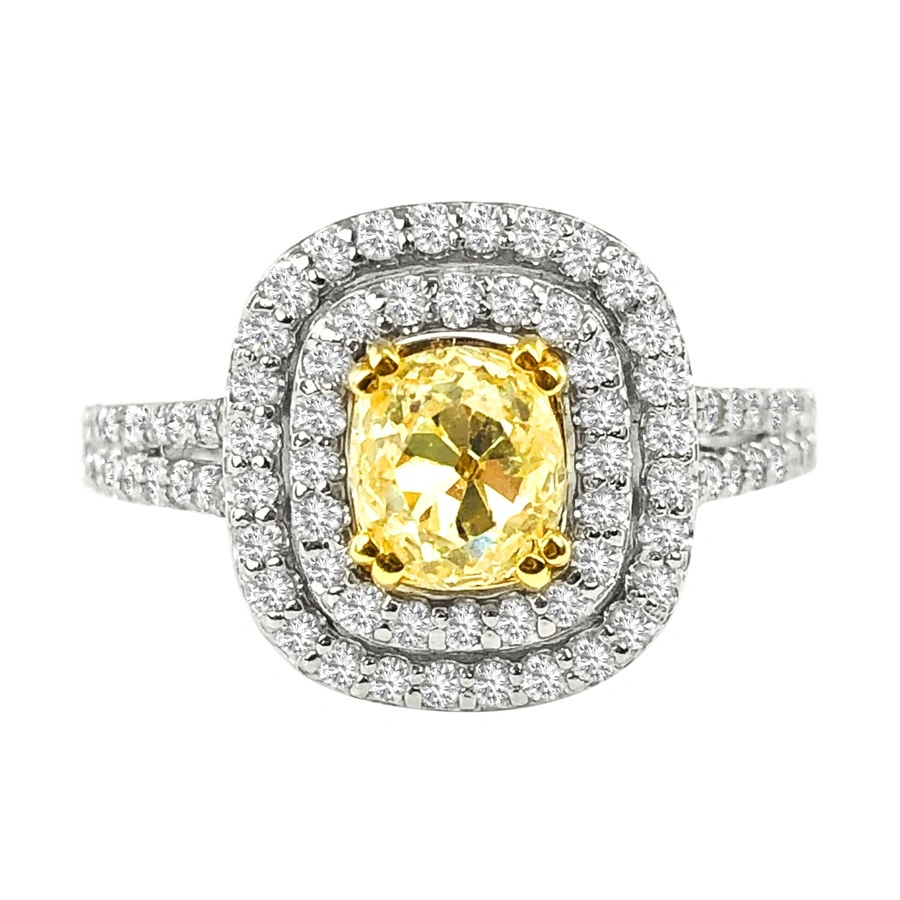 The fanciest of yellow diamonds. This light fancy yellow, VS in clarity diamond is 1.01 carats total that is truly a wow factor. We have one halo surrounding this precious stone that totals eighty diamonds. These diamonds are G in color and SI in clarity. They add up to .7 carats total that makes the total diamond weight over 1.7 carats! Set in 18k white gold. Compare at $17,099.00 Please call us if you need an alteration not offered here.
