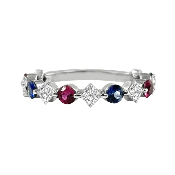 From our 2021 Color Inclusive Collection. Made in America Ring. Red white and blue: .38 carats rubies, .38 carats blue sapphires and .65 carats G-H, VS-SI diamonds. Set in 18k white gold.
