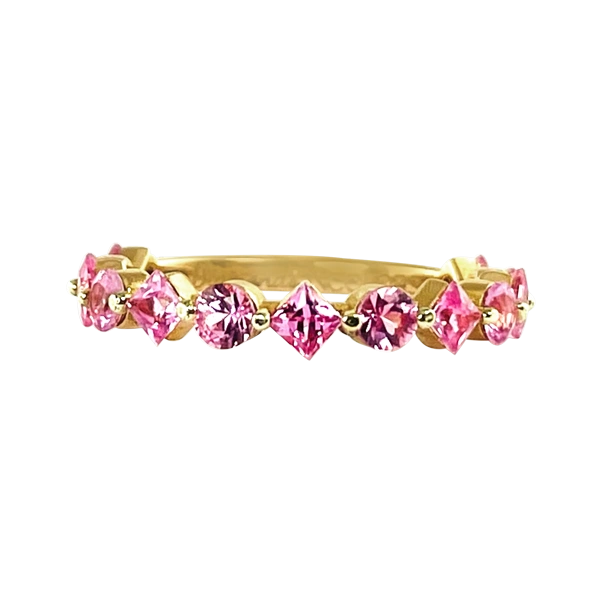 From our Color Inclusive Collection, this stacking ring consists of 1.68 carats of pink sapphires. In a 3/4th`s stack setting, you have sapphires almost completely around the band. Set in 18k rose gold. Please call us if you need any alterations made to this piece.