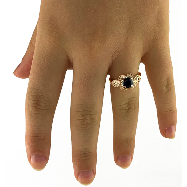 A 1.12 carat certified non-heat-treated blue sapphire with 44 diamonds weighing .31 carats. The setting in this ring is 14k rose gold and designed in a way that says “look at me!” Compare at $14,999.00