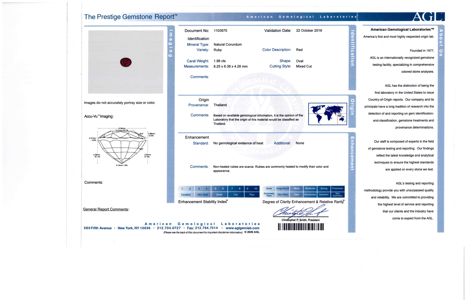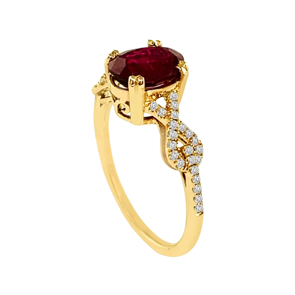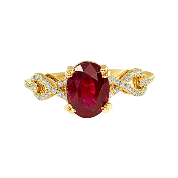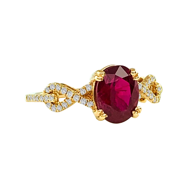 This ring has diamonds twisting their way towards a 1.98 carat and AAA in clarity ruby. The color of the ruby is evenly distributed without visible inclusion. The diamonds are H in color and SI in clarity. All forty-four diamonds weigh .18 carats. Set in 14k yellow gold. Compare at $29,999.00 Please call us if you need an alteration not offered here.