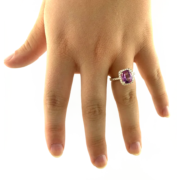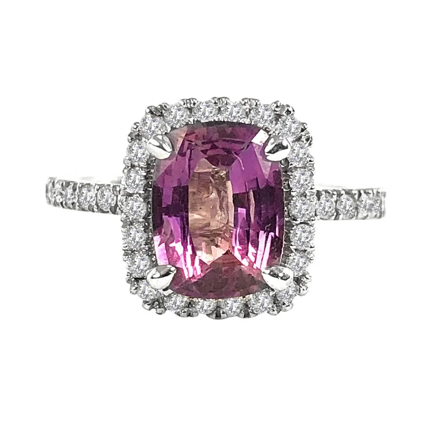 This diamond and pink-purple sapphire has 2.31 carats total. A stunning “cotton candy sky” all in one stone. Haloing this stupendous stone are fifty-seven diamonds that are H in color and SI in clarity. The total carat weight is .55 carats. Set in 14k white gold. Compare at $9,900.00 Please call us if you need an alteration not offered here.