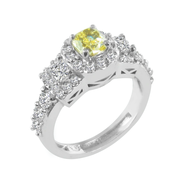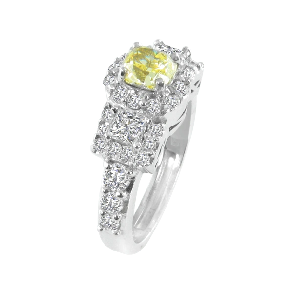 A diamond of substance. This beauty of a ring has a fancy yellow, GIA certified .79 carat diamond that is VS in clarity. Thirty-six G, VS diamonds halo this beautiful stone for a total weight of 1.25 carats. This ring will follow you to the most elegant galas and summer nights in Paris. Set in 18k white gold. Compare at $23,599.00 Please call us if you need an alteration not offered here.